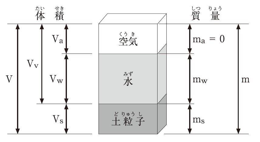下図の土の構成を表した模式図の記号を用いて、 「湿潤密度$\rho_t$」と「飽和度$S_r$」を求める式の次の組合せのうち、