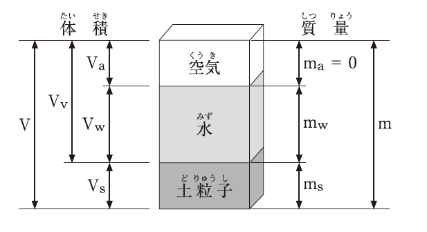 下図の土の構成を表した模式図の記号を用いて、 「含水比w」を求める次の式のうち、